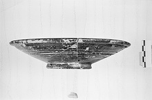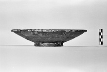 | Description: | Restored in plaster. Deepish body; rolled rim. Outside a groove and two incised lines. Dull black glaze. | |