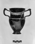 | Description: | Restored in plaster. Moulded ring foot, flaring. High narrow convex-concave body. Two vertical strap handles with leaf thumb-rests. Below handle zone, incised line. In handle zone front and back, necklace pattern in thin clay paint, white lines above. Dull black glaze fired red inside. | |