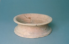 | Description: | Mended from five fragments; complete. Bottom flat, unfinished; concave sides. Pink to buff clay. Unglazed. | |