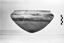 | Description: | Much missing; restored in plaster on the analogy of P 2870. Round-bottomed squat bowl with short upstanding rim. Very thin fabric of pinkish buff clay with dull black glaze inside; two brown glaze bands around body outside. | |