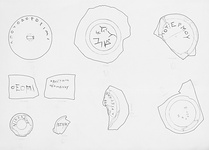 | Description: | Lower part only preserved. Ring base separated from body by concave moulding, so that it approaches profiled foot. Scraped groove around outside and resting surface of ring. On convex center, graffito: <graphic> Attic clay. Good glaze with metallic splotches. | |