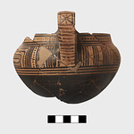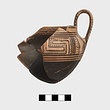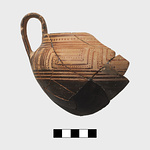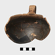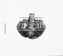 | Description: | Fragmentary; about half the bowl preserved, with a single vertical band handle rising above the rim; none of the base. Small nearly vertical lip. Exterior: below, black glaze. Shoulder, dotted maeander in the center; near the handles, vertical lines in threes alternating with vertical rows of dots; above and below, three black bands. Lip, a row of dots, irregular in size, below two black bands. Handle, horizontal stripes, interrupted near the top by an asterisk. Interior, glazed to just below the lip, then alternating reserved and glazed bands. | |