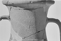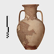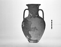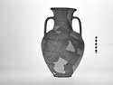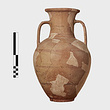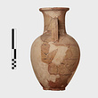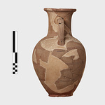 | Description: | Parts of walls, base and rim restored in plaster. Small ring base; egg-shaped body; tall, slightly concave neck; convex lip; strap handles from middle of neck to shoulder. Decorated with glazed bands: three on body; two around base of neck; broad band covering outside of lip. On each handle a rough St. Andrew's cross, the lines crossing at the top of the handle. Pinkish clay, slipped with buff; the glaze much worn; the surface pitted. | |