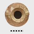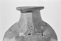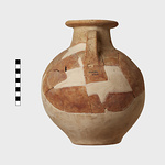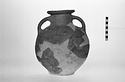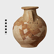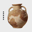 | Description: | The upper part and much of the walls preserved. None of the foot. Round body; nearly flat projecting lip; sloping handles, flat in section, from neck to shoulder. A row of small deep holes impressed along the top of each handle; on one handle, near the lower attachment, the line of dots ends in an irregular rosette. Coarse orange-red clay, full of bits; cream slip. Unglazed. | |