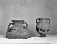 | Description: | Upper part of large amphora; upper area to below shoulder restored in plaster. A number of large fragments from the lower body do not join. None of the base remains. Rounded rim; neck and shoulder form one continuous double curve. Entirely covered with black glaze, except shoulder panels front and back, decorated with concentric circles; a reserved band filled with four narrow bands just below the handle level. | |