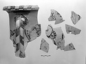 | Description: | Parts of the neck and shoulder preserved, the large neck fragment strengthened with plaster. Several fragments do not join. Double round handles with wide spiral bands. Band inside rim. Outer face of lip in two planes with alternating large dots, resembling a broad tongue pattern. In neck panels: front, part of a winged sphinx seated right; back, vegetal ornament. The fragments from the body preserve part of a large volute and lotus ornament (cf. P 4611) and two portions of figures, one the front legs of an animal walking right, the other the front legs of a seated sphinx(?). Glaze black to brownish; plentiful incision. Ζ 1662: Six additional fragments, joining. These give part of the neck and shoulder. On the neck: part of the haunch and wing of a sphinx crouched to right. On the shoulder: the upper part of a mounted man, to right; head in outline, body in black, incision for arm, double spiral filler in field behind. Black glaze much flaked. | |