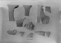 | Description: | Handle of a pitcher of coarse micaceous red clay. The ends of a wavy double line incised around outside of rim. Three pairs of wavy lines incised down outer side of handle. | |