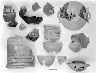 | Description: | From a large bowl or krater or oversized skyphos with low rim. On lower body, bands; in panel in handle zone, part of a lion leaping right, zigzags in field; to left, five vertical bands, then vertical intertwined wavy lines. Slip; inside, thin brownish glaze. ADDENDA Agora Sample no. 522. Sample, spectographic analysis, Fitch Lab, June 1978. | |