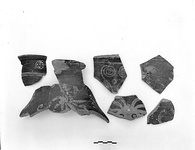 | Description: | From a closed pot. Outside, red glaze. Between horizontal bands of added white, vertical "running dog" pattern also in added white. Attic clay. | |