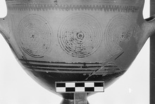 Description:   About half the body with one handle missing. High conical base with reserved band at bottom. In handle zone, three sets of compass drawn concentric circle; below, three reserved bands; above, zigzag below two reserved bands.