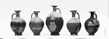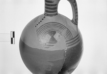 | Description: | High ring foot, squat eggy body, narrow straight neck and flaring round lip. One handle, shoulder to below lip. Glazed to shoulder. On shoulder, above the reserved bands, three sets of seven concentric half-circles. Hour glass inside. Vertical dot rows between. Bands on neck and handles. | |