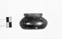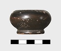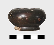 | Description: | Low flat base. Flat inner rim. Two grooves around outer edge of rim and just below it. Small central opening. Good black glaze over all. | |