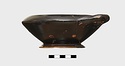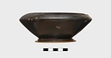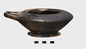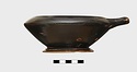 | Description: | About one-quarter of the body with most of the rim missing. Flaring ring foot, grooved on upper face. Lower and upper body meet at sharp angle; the upper body slightly convex with a turned down rim. One horizontal loop handle. Entirely covered with black glaze, except reserved band where rim turns down. Inside glazed nearly to shoulder; rings and dot underneath. | |