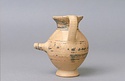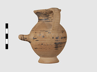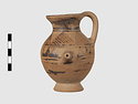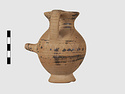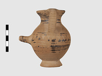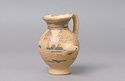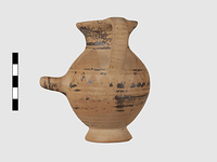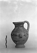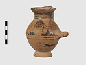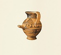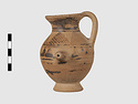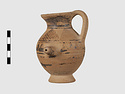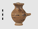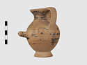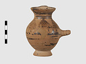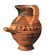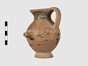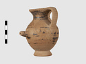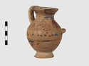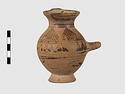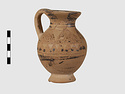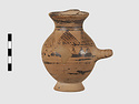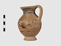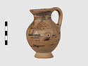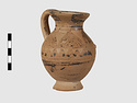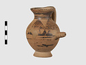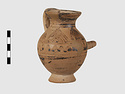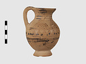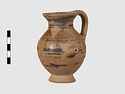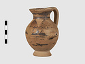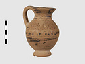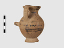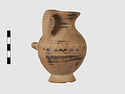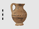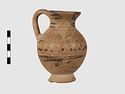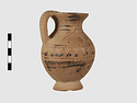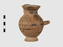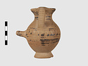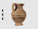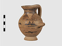 | Description: | Complete except for a small chip from body and from lip. A small one-handled jug, with a spout protruding on the side. Five cross-hatched triangles on shoulder, solid small triangles around body. Flaring foot. Barred handle. Glazed below. | |