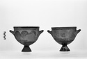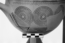 | Description: | Two fragments from upper part preserved; each with handle attachment. Restored in plaster. Lip black, with narrow reserved line inside. Outside, broad decorated zone, top to bottom: black band, horizontal zigzag; series of concentric compass-drawn circles, three on each side; three black bands; bands from the handles continued diagonally over the latter. Bottom plain black. | |