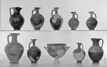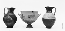 | Description: | Fragment from upper part preserving three sets of compass-drawn concentric circles above three black lines. Solid black body. Banded handle, preserved to lip. Restored in plaster. | |