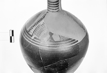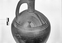 Description:   About half the lip, most of the handle, and large fragments from the body missing. Restored in plaster. Unusually tall thin neck. Neck and handle banded. Shoulder ornament: three groups of concentric semicircles with hour-glazss centers, separated vertical divisions, single line with dots on either side; three bands below. The body black.