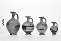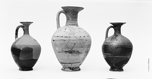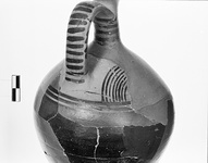 | Description: | The body fragmentary; restored in plaster. Shape similar to P 6853 (ΚΚ 179). Neck and handle banded. Of the shoulder ornament only parts of two sets of concentric semicircles remain at the back; above three black bands. Body glazed. Sharp differences in color caused by burning after breaking. On the unburned portions the glaze is bright red to brown; on the burned portions (clay gray), the glaze is black. | |