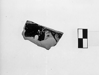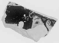 | Description: | From a large closed pot (column krater), unglazed inside. Above, traces of border: tongue pattern? At right, youth's head, left, wearing purplish ivy wreath and a long lock before his ear. In front of him, a bit of some object, perhaps a cup or drinking horn. Cf. P 4674. Relief contours; hair outline reserved. There seems to be a pink wash over the flesh. | |