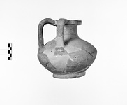 Description:   Small parts of lip, body and base restored in plaster. Ring foot; squat sharply bulging body, plain lip with overhanging edge. Two handles, set close together, rim to just above point of greatest circumference.