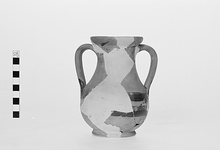Description:   Fragmentary; profile complete. Restored in plaster. Ring foot; plain lip convex outside. Curving band handles, just below lip to just above point of greatest circumference.