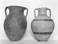 | Description: | Mended from many pieces; a number of not very important fragments missing, with most of the flat bottom. Handmade; red to grayish clay. Cf. Desborough (1952), p. 11 (under P 6997). | |