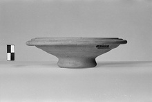 | Description: | Rather high ring foot; out-sloping rim, neatly ridged. Incised on the floor: <graphic> Thin wash of black glaze over floor. | |