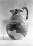 | Description: | Base missing; body much mended; fragments missing. Trefoil mouth; plain band handle. Double bands of added white on lower body and below handle zone; one(?) band below lip. On shoulder, alternating loops, and vertical stripes of running dog in added white. Red glaze, somewhat peeled. | |