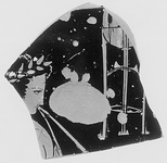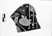 | Description: | From a bell krater, shiny black inside, with a bit of a reserved line at the top of the fragment. Head of youth right, wearing wreath and fillet, and playing double flute. In front of him, a tripod. Added white for wreath and fillet on youth's head, and for fillets hanging down from tripod. Brown for inner drawing and for shading of eyelid. Relief contours. | |