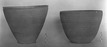 | Description: | Mended from many pieces; part of one side missing. Flaring type; the hole was cut out after the pot was baked. Clay pinkish-buff outside; gray at core. Sharply marked wheel grooves on the outside. | |