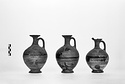 | Description: | Chip missing from lip; lip warped. Flaring ring foot and round body with narrow straight neck and flaring round mouth; one band handle, shoulder to below lip. Lower body and foot glazed black, much peeled, with three reserved bands. On shoulder, compass-drawn half-circles, concentric, and three straight and two wavy lines, down front. Bands on neck and handle. | |
