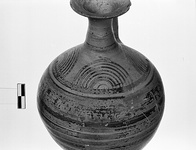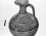| Description: | Similar to P 7075 (ΠΘ 941) in shape and decoration. Three sets of concentric circles on the shouler. Brownish glaze, much peeled. ADDENDA P 7075: Flaring ring foot and round body with narrow straight neck and flaring round mouth; one band handle, shoulder to below lip. Lower body and foot glazed black, much peeled, with three reserved bands. On shoulder, compass-drawn half-circles, concentric, and three straight and two wavy lines, down front. Bands on neck and handle. | |