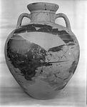 | Description: | Mended from many pieces; filled out in plaster. None of the foot preserved. The body glazed, save for a band of five reserved lines around the body below the handle attachments. Lip and handles glazed. Neck reserved, ornamented front and back with a double triangle enclosing a St. Andrew's cross, framed on either side by a vertical zigzag and a straight line. Small compass drawn dot and circle on each side of the triangle, on one face only. Attic clay; black to red glaze, much peeled. | |