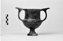 | Description: | One handle and bits of lip missing. Restored in plaster. Moulded base with scraped groove underneath and another around. Thumb-rests on handles. Dull black glaze, somewhat peeled. | |