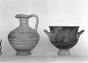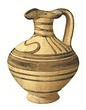 | Description: | Intact. A bulging oinochoe with wide trefoil mouth. Spreading foot nearly flat beneath; handle from lip to shoulder. Lip glazed; rings around neck, vertical bars on handle; on shoulder, four pendents on one side and three on the other, on either side of a motif formed by two intersecting wavy lines. Broad band bordered top and bottom by two narrow ones, on body. Pale buff clay with very light greenish-buff slip. Decoration in brown glaze, mostly peeled. Submycenaean. | |