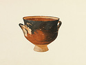 | Description: | Intact save for chips from foot. Deep body on small conical foot; slightly flaring lip, two small horizontal handles. Body glazed black, fired red in patches; glaze somewhat peeled. Reserved: foot and wall immediately above it; handle spaces; a band on the inside of the lip, and a large dot at the center of the floor. Submycenaean. | |