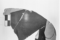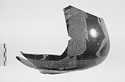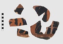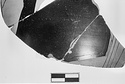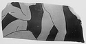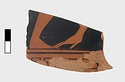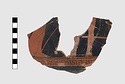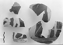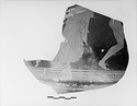 | Description: | Seven fragments. Plain maeander, left, below figured zone. Inside unglazed. a) Preserves the wall of the vase from the top of the lower cylindrical portion to near the top of the figured zone. Parts of three figures: center, a draped male, bearded, standing left, holding a staff over his left shoulder. A second staff rests on the ground in front of his feet, crossing diagonally from the left. At the left, a left foot, left, the weight resting on the ball. At the right, the lower part of a nude figure, moving right. Between the last two, an inscription, painted in red. b) Part of the border, and of two figures: at the left, a standing draped figure, right, a staff, perhaps his, in the field. At the right, a nude figure, facing; the left leg seen in front view, the right in profile to left. In the field behind him, a pick. c) Part of the border (chipped), and bits of two figures: a foot right, and a right hand, its fingers resting on the toes of the foot. d) Wall fragment: parts of two nude youths, right, he at the left seated, his bent left arm resting on bent left knee; he to the right standing. Along the break at the right, traces of some representation. e) Wall fragment (not certainly belonging). At the left, an outstretched arm, with folds of drapery hanging over it. At the upper edge of the fragment, seen against the line of arm (or hand), is a bit of added purple. At the right, part of a draped standing figure. f) From near the top; above, tongues, at the left edge a bit of a head with an incised scalloped hair outline, and a narrow purple fillet. g) A scrap of the lip of this or another psykter, flanged for a lid; (cf. P 6639). Glazed inside; outside, upper part and top of flange reserved. At junction of neck and shoulder a fine moulded rim, with a scraped line above and another below. No pattern on the bit of shoulder preserved (contrast fragment f). [i.e. probably not this pot; missing since 1957.] Relief contour carefully drawn throughout except on fragment e) where it is partial only. Inner drawing scanty, sketched with dry point. The sharply incurved wall of the vase, just below the maeander border, is much worn from use. Fine pink clay; good glaze. Fragment e) appears rather browner, and more micaceous than the others. | |