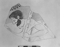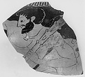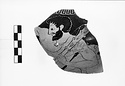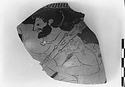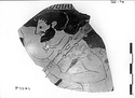 | Description: | From the shoulder of a closed vase, probably the same shape as P 7240, which the fabric closely resembles. Traces of burning. Above, a border of squared tongues. Below, Herakles, his body in front view, looking left. His right arm is outstretched, his left arm bent; in his left hand he holds his club, which rests agains his shoulder. Behind the bent left elbow can be seen his lion skin (draped over a rock against which he is relcining(?). Hair outline incised. Very heavy relief contour for other outlines. Inner drawing partly in sketch-lines; partly in dilute glaze. Dilute wash on the pelt. ADDENDA "Earliest Kleophrades (manner of Euthymides) like the vases publsihed by Miss Richter." (letter form J.D. Beazley, Oct. 1, 1936). Not from a psykter (as ARV, p. 125, no. 59; CB II, p. 8, no. C5) but from a stamnos. (A. Ashmead, May 20, 1957). | |