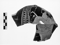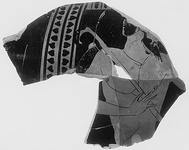| Description: | Probably from a column krater. Panel framed by tongue pattern above, ivy border on side. A nude bearded man wearing a purple wreath moves right, carrying a cane over his right shoulder. Relief contour for nape and lower arm. Relief lines for the edge of the beard. Dull brown circles for the nipples. Some light brown curves on the body apparently intended to indicate the stomach muscles. Glaze inside thick below, thinning toward shoulder. No burning. | |