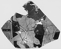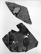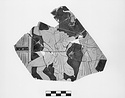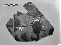 | Description: | Mended from several fragments. Parts of two figures remain; the best preserved is a partly draped male figure, dancing left, with his head turned back and his body twisted to face a second figure who advances playing a flute. The himation of the first figure is draped over his left shoulder and trails behind. Between the two figures, above, is a boukranion; at the left of the fragment is an upright object (part of a building?). Accessory white is used to ornament the horns of the boukranion, the border of the himation, and the building. Attic clay; inside, black glaze with reserved stripe. | |