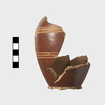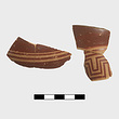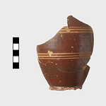 | Description: | The body fragmentary; one small fragment from the shoulder does not join. None of top preserved. Ring foot; tall slender body. Body glazed, with triple reserved bands. Gritty yellow-buff clay, with highly metallic red glaze. ADDENDA Non-joining fragments of shoulder and of neck with battlement maeander found later. | |