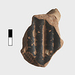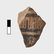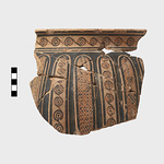 | Description: | One fragment, mended from several pieces, preserves part of wall and rim; two rim fragments and five wall fragments do not join. Low, slightly concave neck; narrow rim, projecting slightly. Broad shallow ribs on the body. On alternate ribs, linked concentric dotted circles, running vertically, and parallel horizontal zigzags. On rim, between bands, dotted linked concentric circles. On outer face of edge of rim, stroke series. Bluish-black glaze; inside thinner, brownish. ADDENDA P 25404b (ΠΘ 3561b) also belongs; part of loop handle. | |