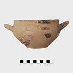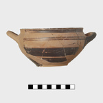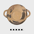 | Description: | About one-third of rim and body preserved with part of one handle; none of the base. Restored in plaster. Two handles, tilted slightly up. Glazed to handle zone, with reserved band. In handle zone, triple band. Rim glazed, with two fine reserved bands. Reserved band inside rim, and another inside, well down. Streaky black glaze. | |