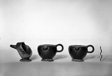 | Description: | Front part and base preserved, with a spout. Low conical base, flaring; sharply flaring walls; narrow inturned rim; open top; small tapering spout; handle (broken off) at right angles to spout. Glaze black to red, somewhat peeled. Base reserved at edge and beneath; washed with pink. ADDENDA Handle seems to have been horizontal, like a skyphos handle, with the handle space reserved and washed with pink. | |