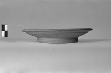 | Description: | Lip chipped. Horizontal rim with two grooves. Ring foot. Floor only, covered with thin red glaze. | |