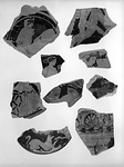 | Description: | On top surface, the lower part of a draped female figure; the garment is decorated with dot rosettes and broad irregular bands; sketchy relief lines. On the flange is an ovolo pattern; inside, plain black glaze. Attic clay. Published with P 39b as part of same lid. | |