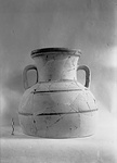 | Description: | Many body fragments, one handle, and all of bottom missing. Restored in plaster to the middle of the body. Plump body, rather short slightly concave neck, rounded lip and flat handles, vertical. Red glaze bands, widely spaced; wavy vertical line on handle. Pinkish-buff clay, with buff surfaces. | |
