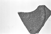| Description: | Fragment from the floor of a Samian B plate or bowl, broken all around. On the floor, within a double circle: <graphic> Fine brown micaceous clay; red glaze slightly flaked. | |
