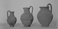| Description: | Ring foot and round mouth with projecting lip grooved on the top, and indented at the handle attachment. Shallow grooves to shoulder; handle grooved. Pinkish-buff clay; buff surface; unglazed. | |