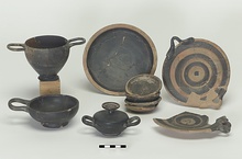 | Description: | Chip missing from floor. Shallow, with ring foot. Two grooves on upper face of rim which slopes inward very slightly. Black glaze over all except on rim. | |